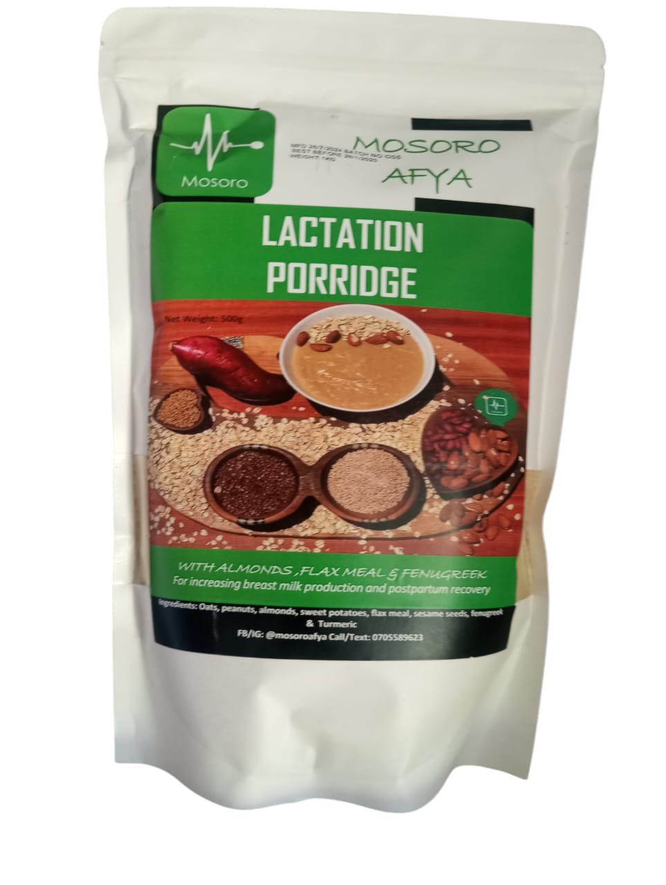 Our Lactation Porridge Flour combines nutrient-dense grains, seeds, and roots traditionally known to support breastfeeding. Flax and sesame seeds help enhance milk supply, almonds and peanuts provide healthy fats and protein, while sweet potato adds natural energy and fiber. Turmeric contributes anti-inflammatory benefits to support healing and recovery.